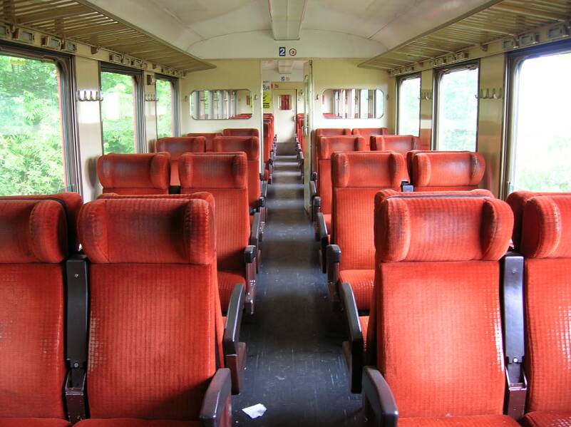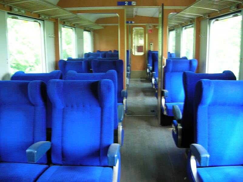 Interessant find ich einen der Schlieren, der zur Hälfte die gewohnte Bestuhlung mit den durchgehenden Bänken, zur andren aber blaue Sitze hat.