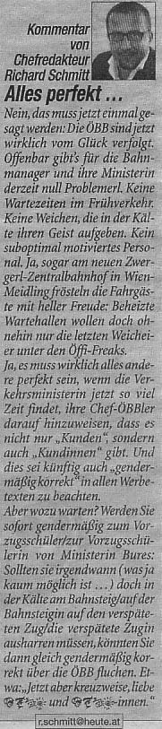 Für die werte Frau Bures scheint es wirklich nichts wichtigeres derzeit zu geben, als die ÖBB darauf hinzuweisen, daß in Werbeinserate gefälligst auch die weiblichen Bahnfahrer direkt angesprochen werden.