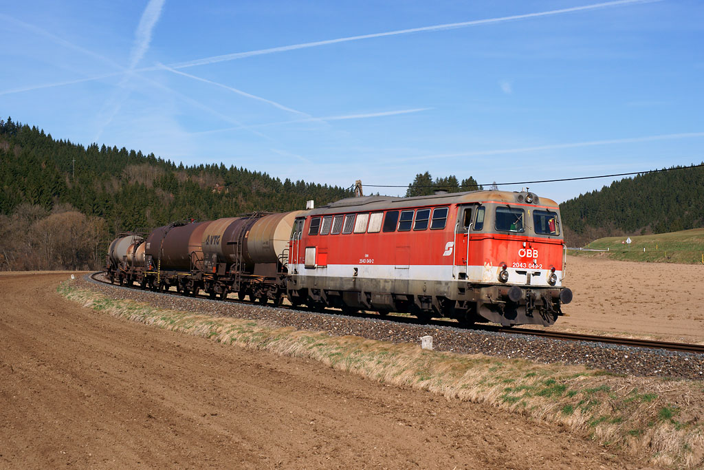 Diese Woche kam lang längerer Abstinenz wieder eine Maschine der Baureihe 2043 im Fahrverschubdienst rund um Brückl (Görtschitztalbahn) zum Einsatz.