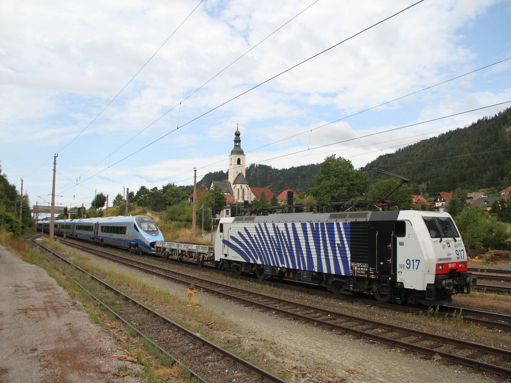 Lokomotion 189 917 mit PKP Pendolino als Überstellfahrt von Italien nach Polen am 10.08.2013 in Launsdorf