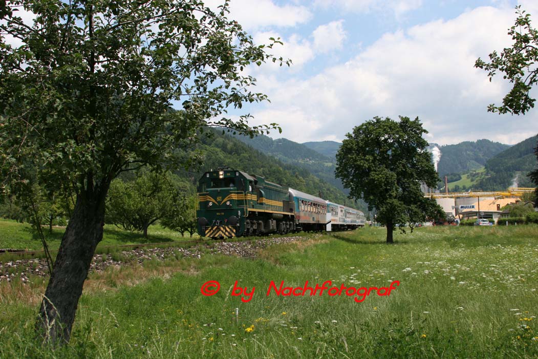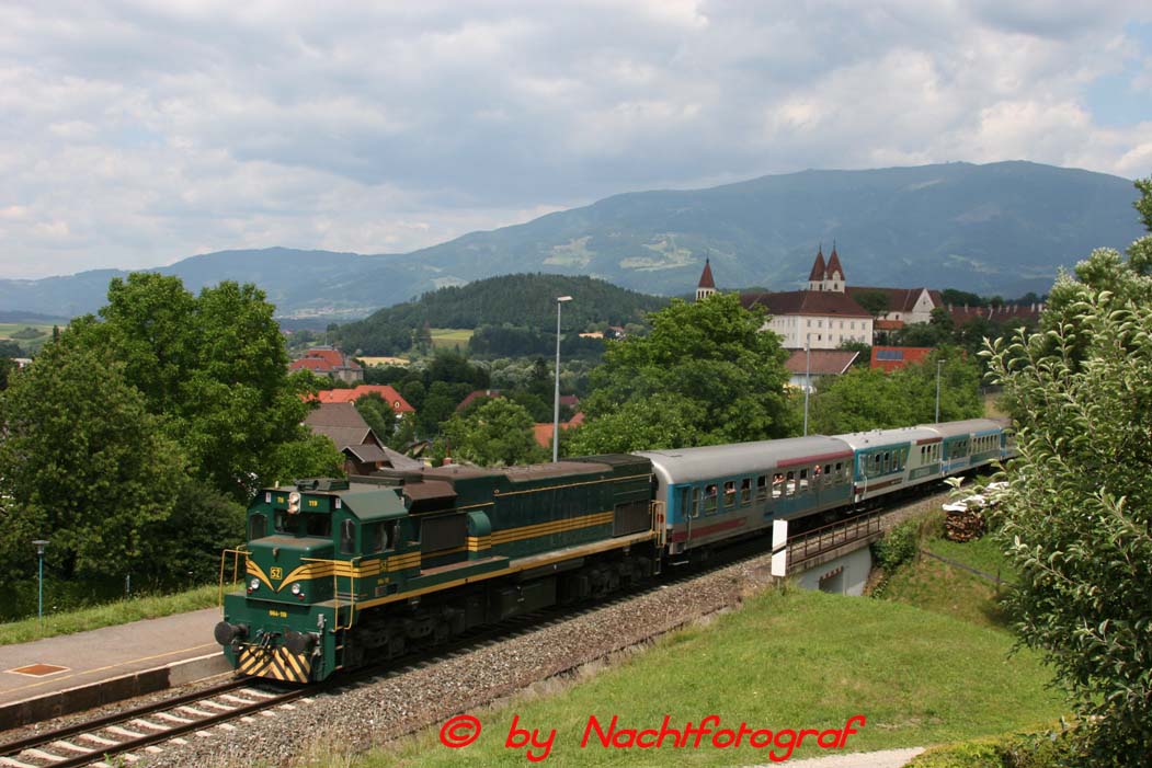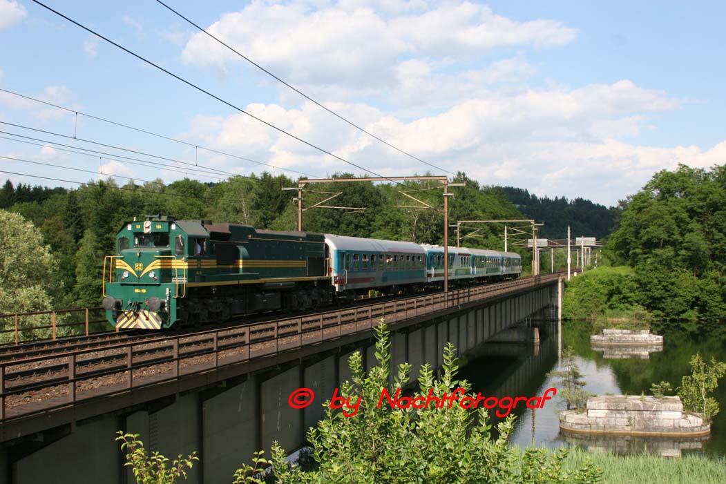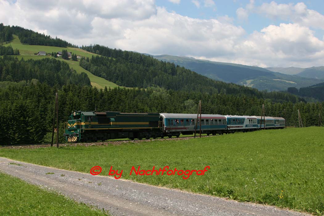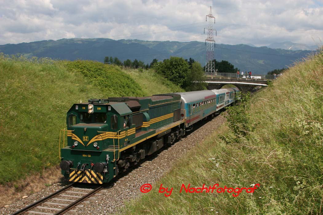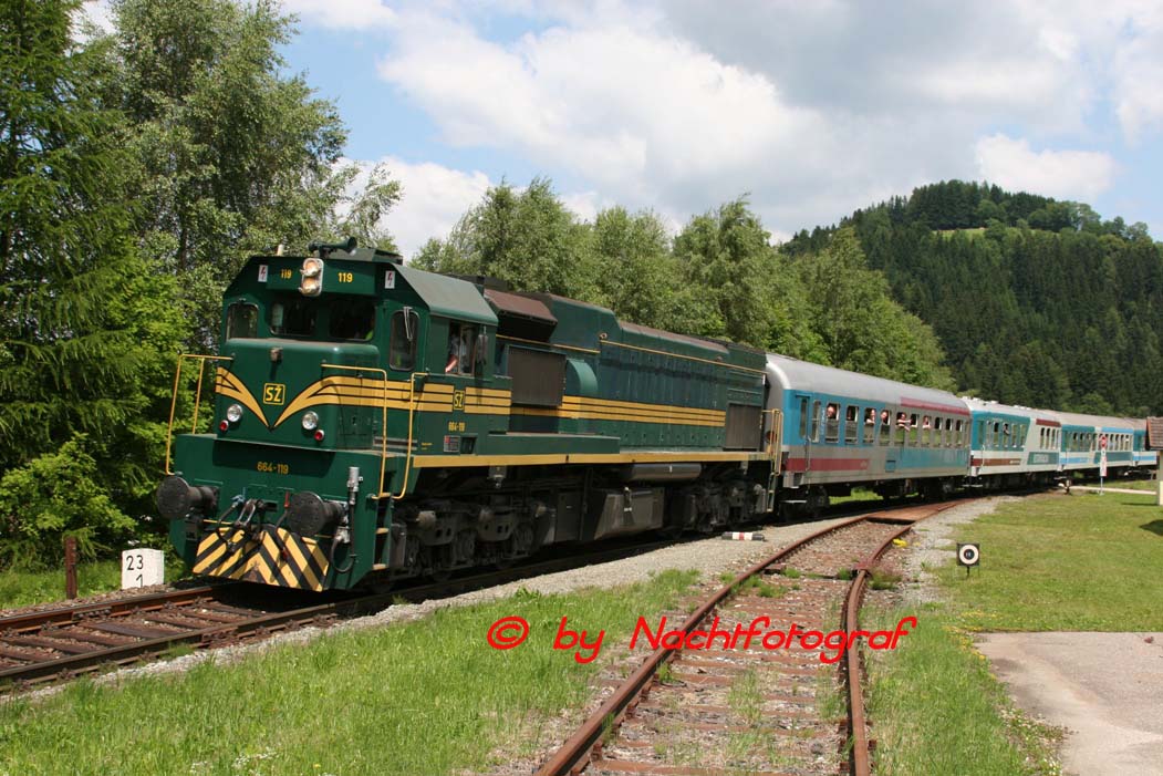 am 25.06.2010 war die sz 664 -119 mit vier sz wagen von maribor - graz - zeltweg - wolfsberg - bleiburg - klagenfurt - villach - jesenice - ljubljana für einen private reisegruppe unterwegs.hier nun einige bilder von diesem zug entlang der lavantalbahn.lgNachtfotograf