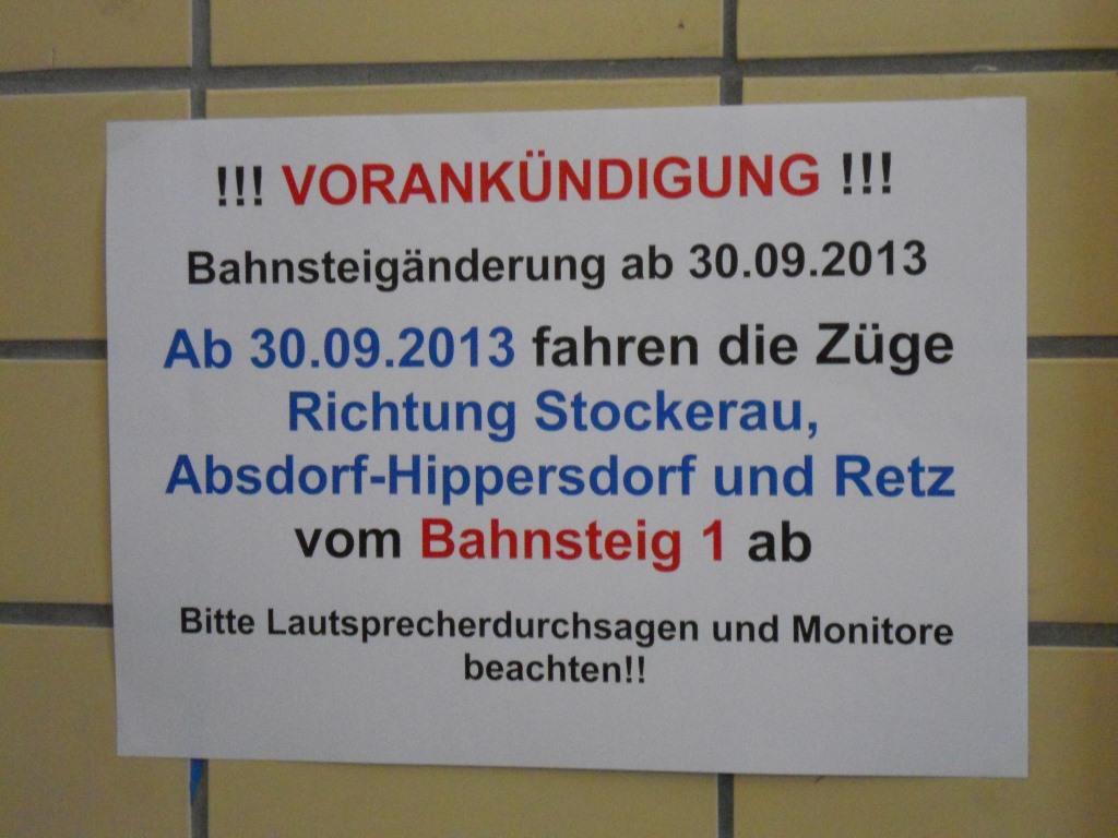 - Züge Richtung Stockerau fahren am ziemlich fixen gebauten Bahnsteig 1 ein. Dazwischen (Gleis 2,3 + Mittelbahnsteig) wird die Unterführung weitergebaut bzw. grad dafür ausgegraben!