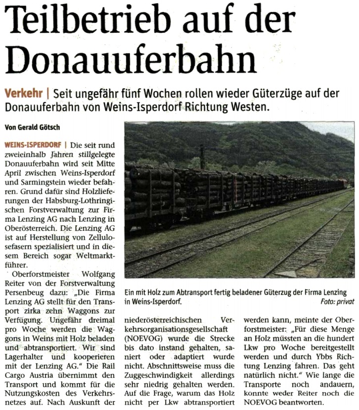 Seit kurzem gibt es wieder Güterverkehr zwischen Sarmingstein und Weins-Ysperdorf. Die dortige Verladelänge wurde sogar auf 10-12 Holzwagen ausgebaut! Hoffen wir, dass diese Transporte lange bleiben werden! Mehr Infos dazu auch hier: http://www.schienenweg.at/index.php?pag ... adID=25285