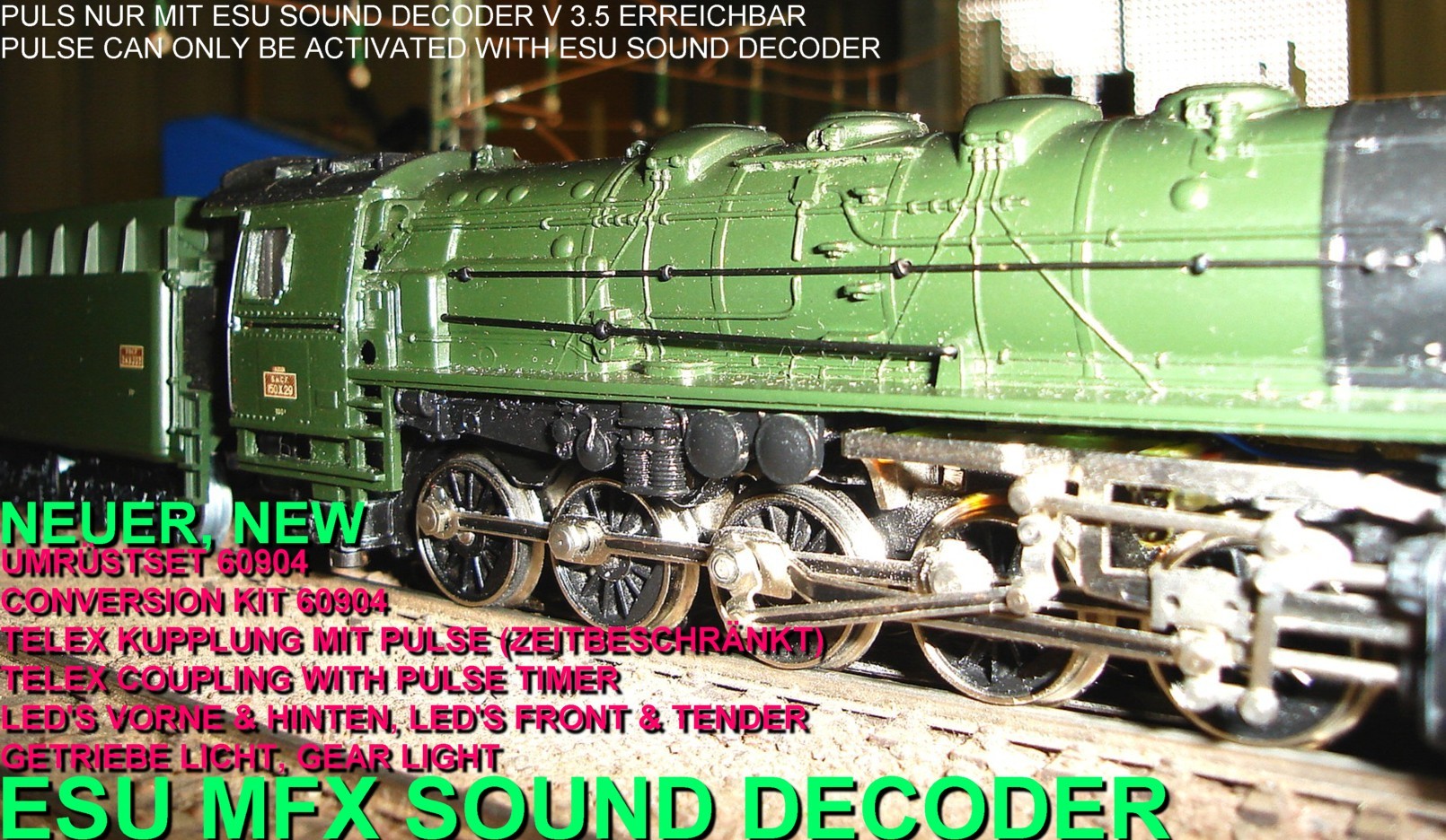 Die Lokomotive wurde mit einem 60904 Umbausetz, ESU Loksound decoder, LEDS's vorne und hinten, Getriebelicht, Raucherzeuger, und Telex Kupplung umgebaut.