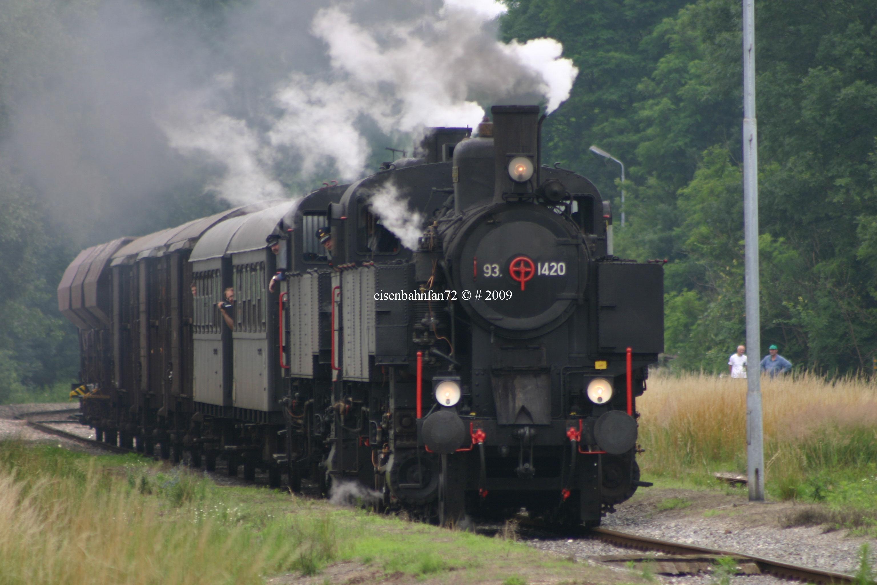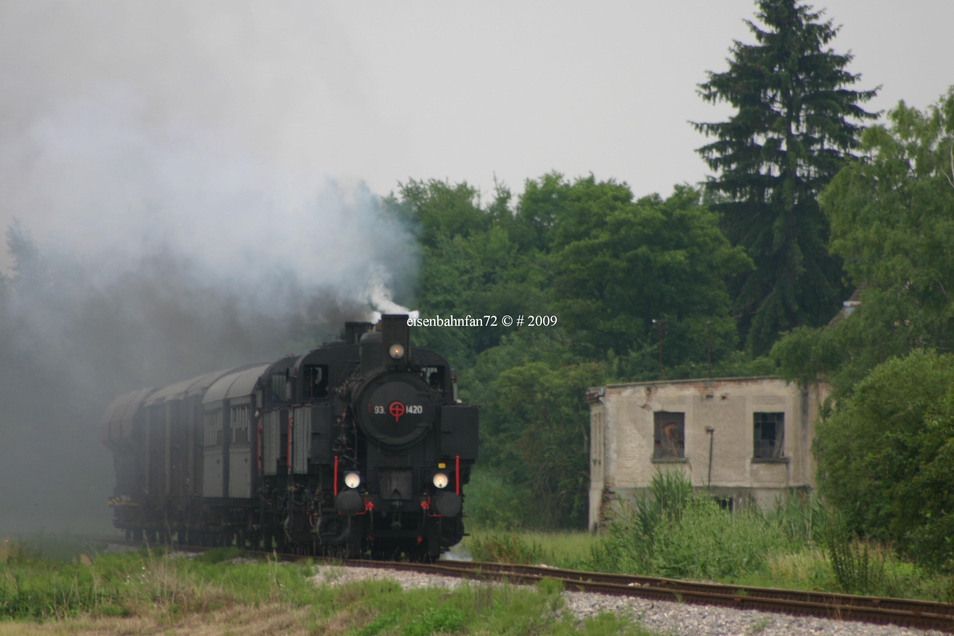 Wie bereits im Termine-Forum von Bahnnews-Austria angekündigt veranstaltete ein privater Eisenbahnenthusiast am letzten Samstag einen zwischen den Bahnhöfen Mistelbach LB und Hohenau verkehrenden Sonderzug der Gattung GmP. Als Triebfahrzeuge dieser vermutlich nicht alltäglichen Veranstaltung kamen jene im Stand der B&B Dampflokomotiven Betriebsgesellschaft m.b.H. befindlichen Dampflokomotiven 93.1420 und 93.1421 zum Einsatz welche mit dem vollständigen Zugverband nächst sowie im Bahnhof Dobermannsdorf bei einer Gegenüberstellung von einem unserer Fotografen bildlich festgehalten werden konnten: